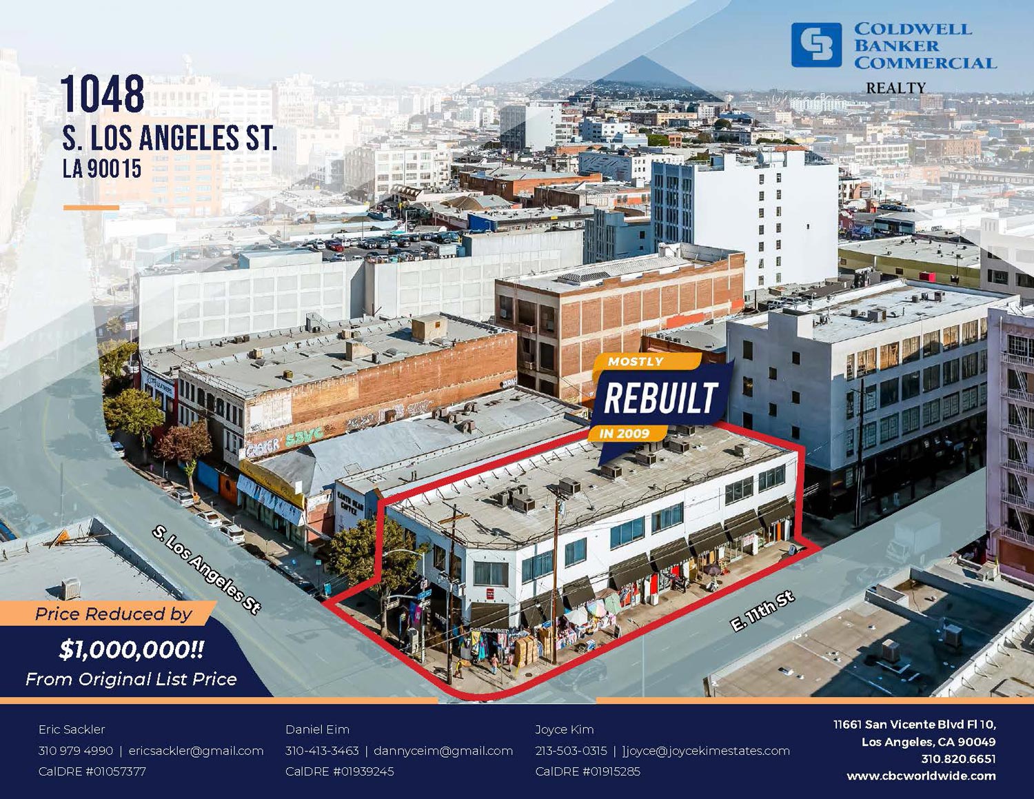 PRICE REDUCED BY $1,000,000!!! Complete remodel includes new roof, plumbing, electrical, HVAC, elevator, floors, walls, drywall, frames and insulation. Within a mile of the Staples Center, LA Live, LA Convention Center, Santee Alley and the Flower Market, 1048 South Los Angeles is an almost fully occupied office/retail building located at the corner of Los Angeles Street and 11th in the heart of Downtown's Fashion District. The property consists of 15 units – 7 office suites above 8 ground-floor retail units. A great opportunity exists for an owner/user to occupy the building or for an investor to increase value by repositioning the asset.